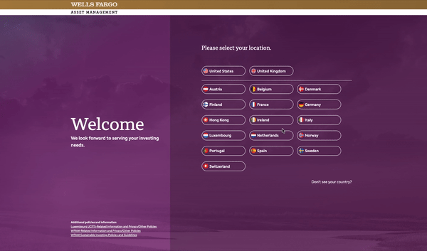 Wells Fargo wanted to integrate the 11 non-US audiences into the new WFAM website. This would include providing country-specific identification (attestations) and integrating the country-specific content. By building this “entrance” to their main website the users can access personalized content.